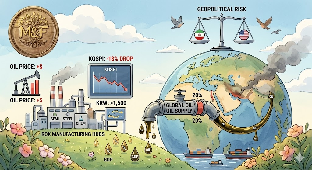 - 공급망 마비: 호르무즈 해협 봉쇄로 글로벌 원유 공급 20%가 차단되어 에너지 집약적 제조 국가들이 직격탄을 맞음.